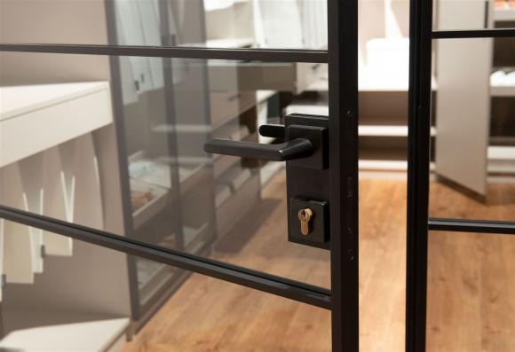 Die 2-flügelige Swing Door Slim Line erweitert die klassische Swing Door Slim Line Zimmertür von raumplus und eignet sich ideal für größere Öffnungen. Der zweite Flügel lässt sich oben und unten feststellen und bei Bedarf leicht lösen. Die Ansichtsfläche kann symmetrisch oder asymmetrisch mit Sprossen gestaltet werden. Erhältlich ist die Tür in Schwarz eloxiert, die Füllung kann individuell aus Dekor, Furnier, Sicherheitsglas oder MDF nach RAL lackiert gewählt werden.