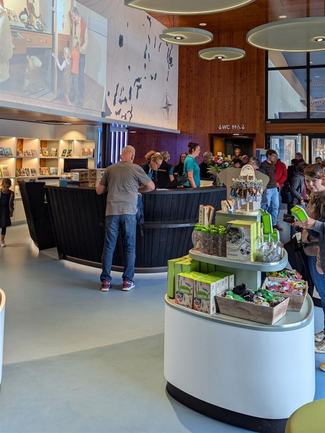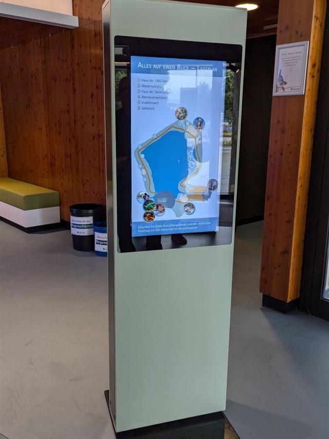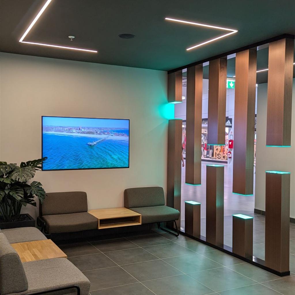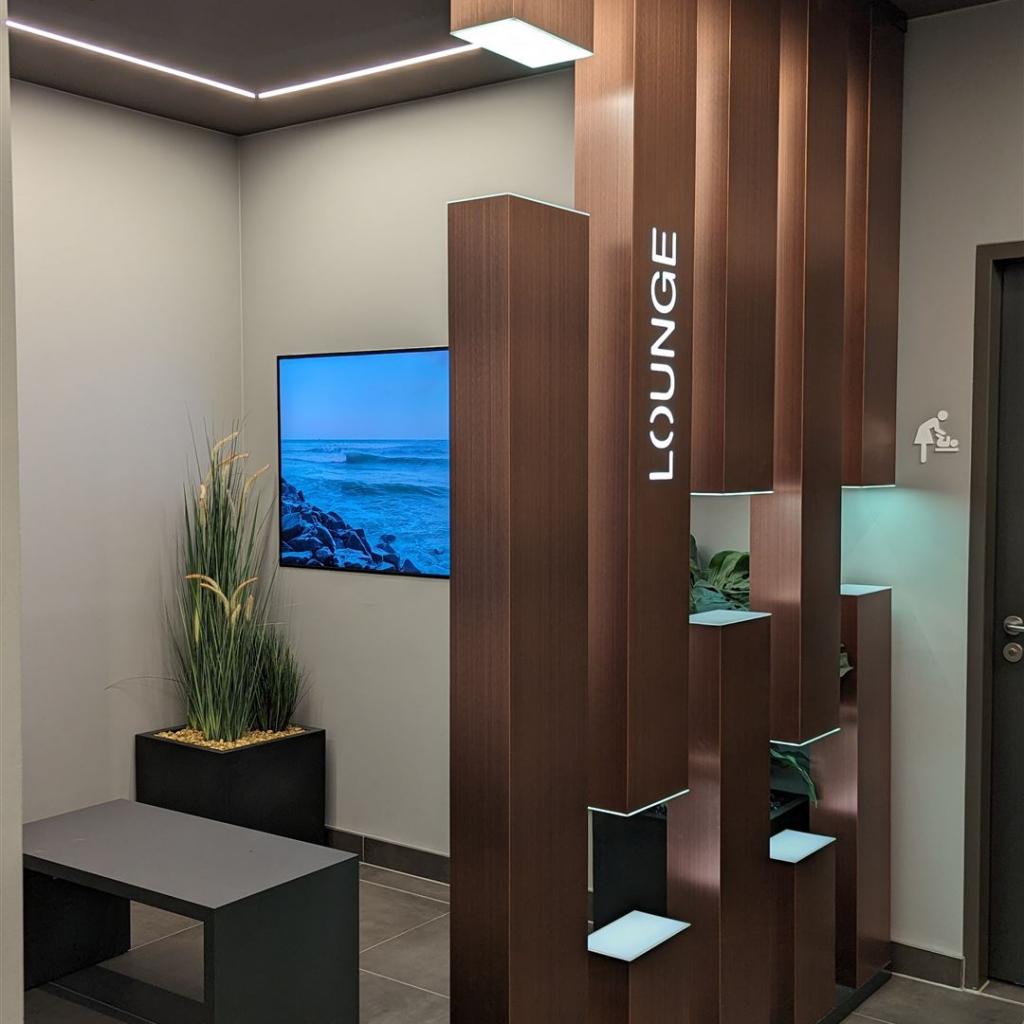 Weiterhin haben wir den Empfangstresen der Außenhülle des Gebäudes nachempfunden, ein 8,5 m langes Shopregal, mehrere Shopinseln, Sitzgelegenheiten und eine Monitorstele installieren dürfen.