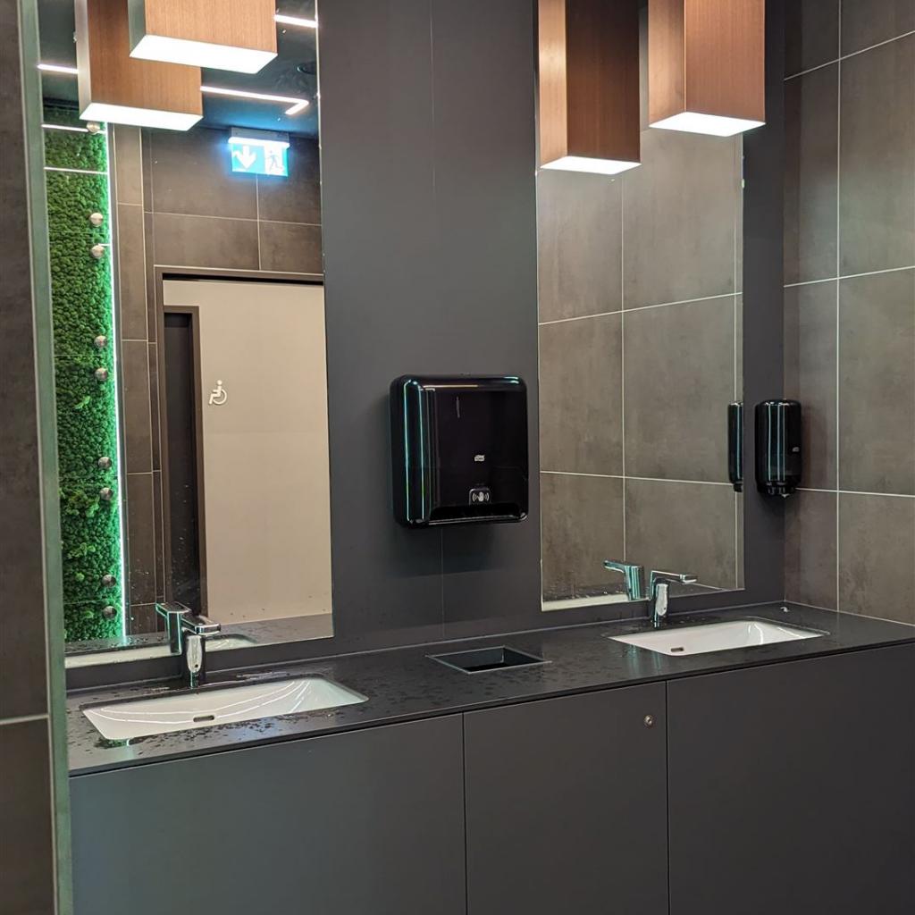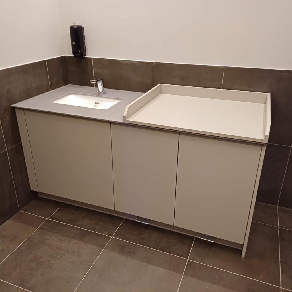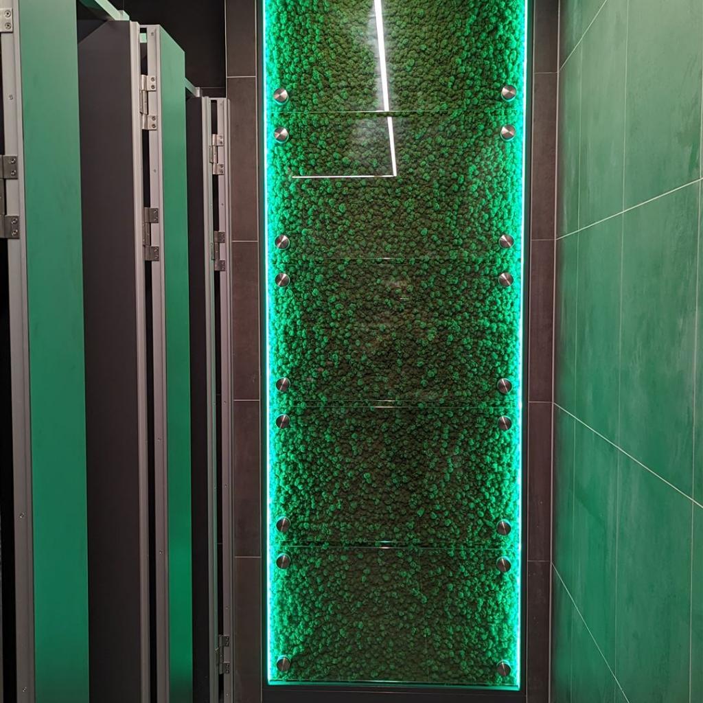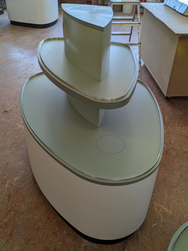 Weiterhin haben wir den Empfangstresen der Außenhülle des Gebäudes nachempfunden, ein 8,5 m langes Shopregal, mehrere Shopinseln, Sitzgelegenheiten und eine Monitorstele installieren dürfen.